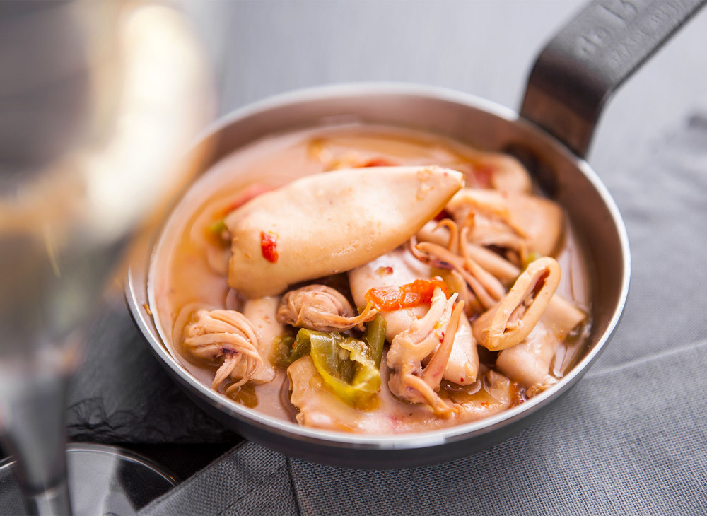 Les chipirons sont des calamars encornets cuisinés au vin blanc agrémentés de poivrons rouges et verts, d’oignons préalablement revenus à l’huile d’Olive au piment d’Espelette.