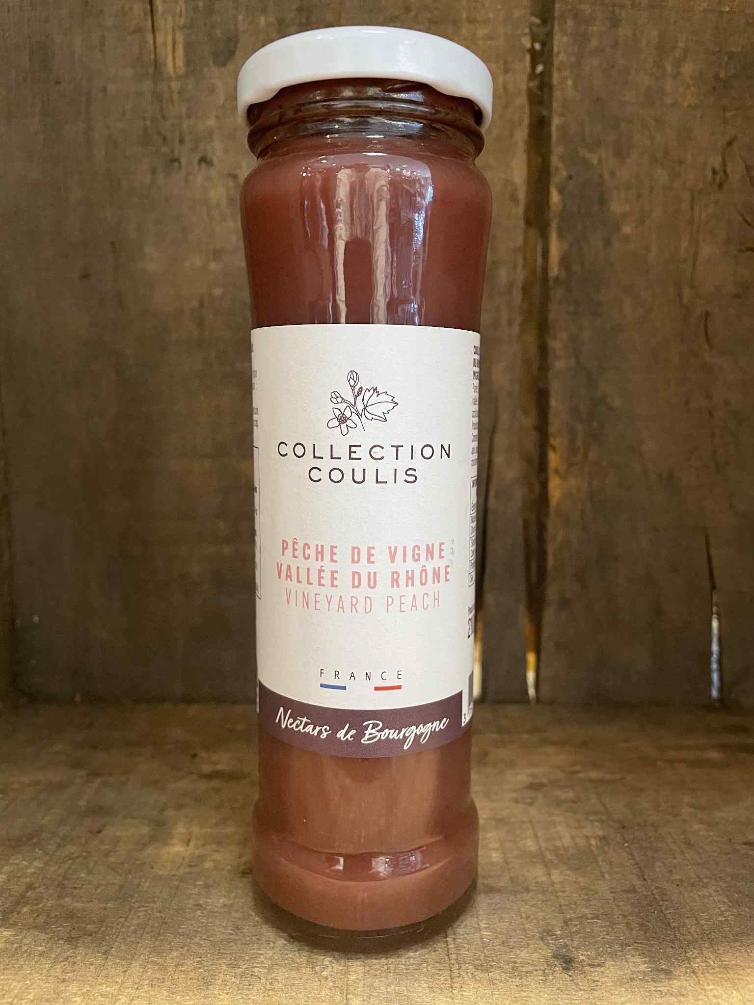 Ce coulis déploie le parfum intense et velouté de la pêche de vigne, avec une douceur naturelle, une légère acidité en fin de bouche, et une texture fluide et brillante. Il évoque les fins d’été et les fruits fraîchement cueillis, avec une profondeur aromatique délicate, presque florale.