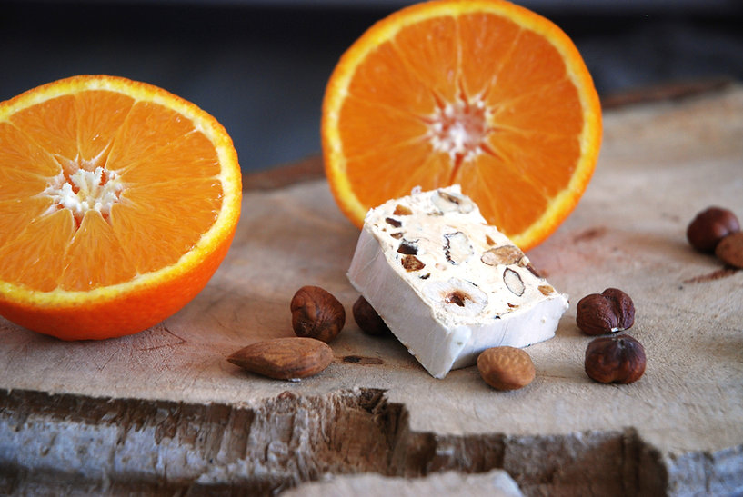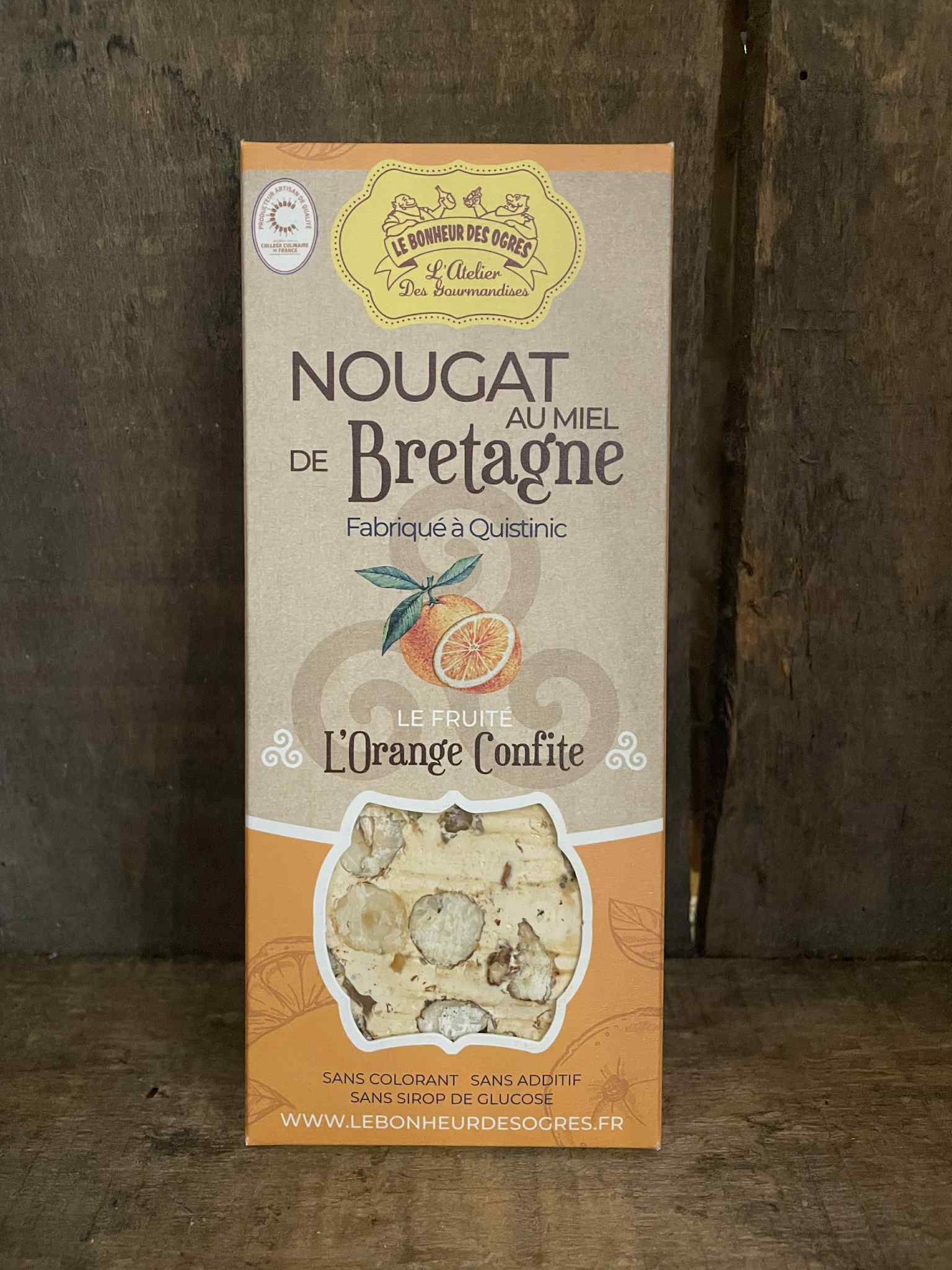 INGREDIENTS / Miel de Bretagne 30% • Sucre de Canne Blond* • Amandes* • Noisettes* • Oranges Confites* 7% • Eau • Blanc d’oeufs déshydratés* • Feuille Azyme* (fécule de pommes de terre* • huile de tournesol) • Sel** • Sucre vanillé* (sucre* et Vanille de Madagascar*)