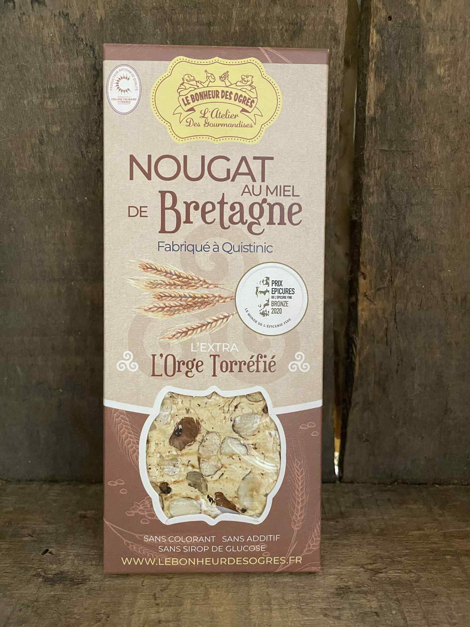 INGREDIENTS / Miel de Bretagne 30% • Sucre de Canne Blond* • Amandes* • Noisettes* • Malte orge torréfié de Bretagne* 7% • Eau • Blanc d’oeufs déshydratés* • Feuille Azyme* (fécule de pommes de terre* • huile de tournesol) • Sel**• Sucre vanillé* (sucre* et Vanille de Madagascar*)