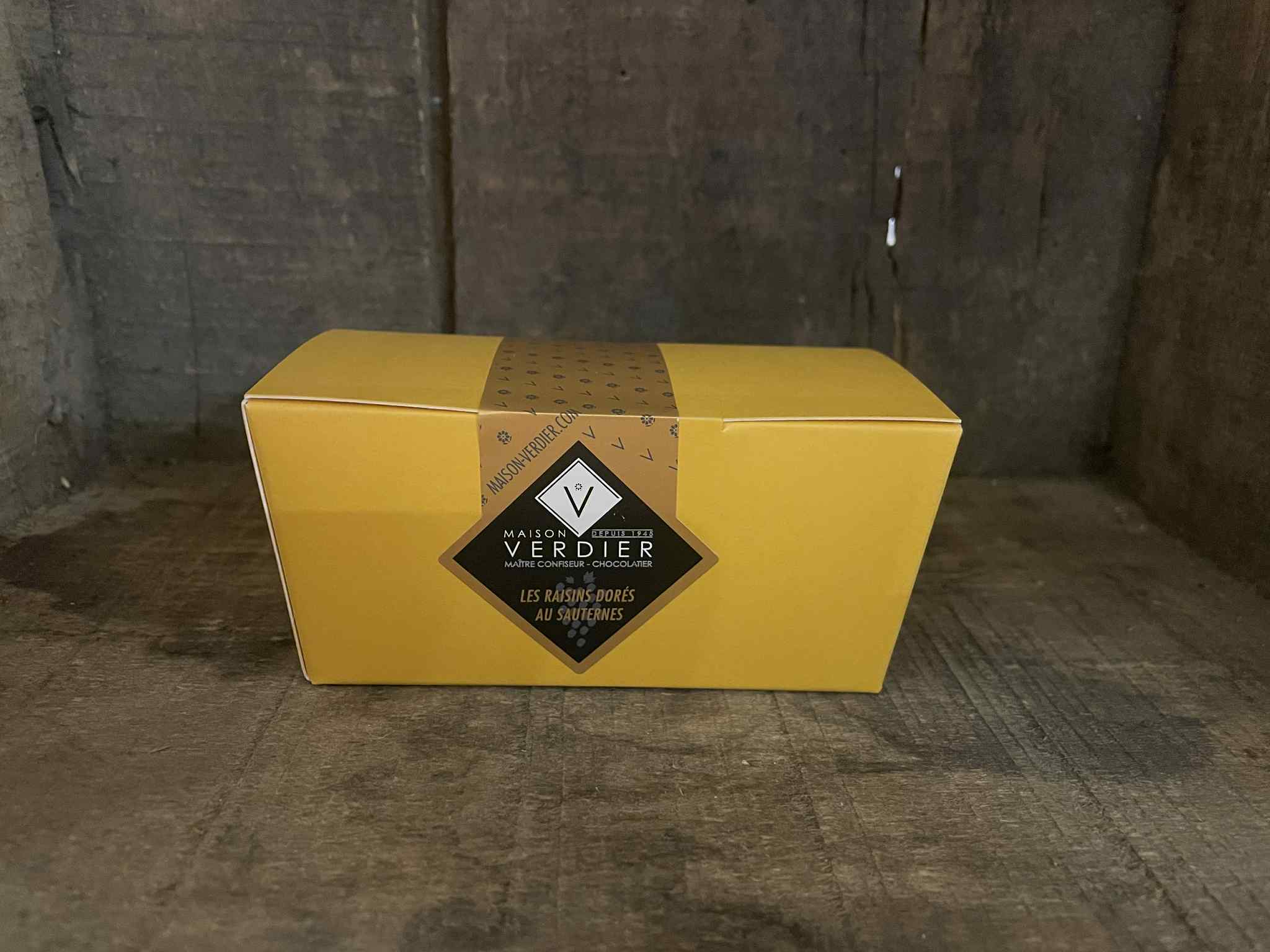 Produit phare de la Maison Verdier, les Raisins Dorés© au Sauternes en ballotin fondants et sucrés sont l’écrin rêvé pour ce fruit magnifique qu’est le raisin ! Lors d’un instant gourmand, il fait l’unanimité ! Idéal avec un bon café ou un thé noir, le Raisin Doré donnera tout son potentiel avec une coupe de champagne ou un bon vin blanc. Ces raisins sont séchés puis macérés dans un vin blanc liquoreux venant des vignobles de Sauternes. Pour rendre ce raisin encore plus irrésistibles, nos maîtres-artisans Chocolatier l’on recouvert d’une fine pellicule de chocolats noir.