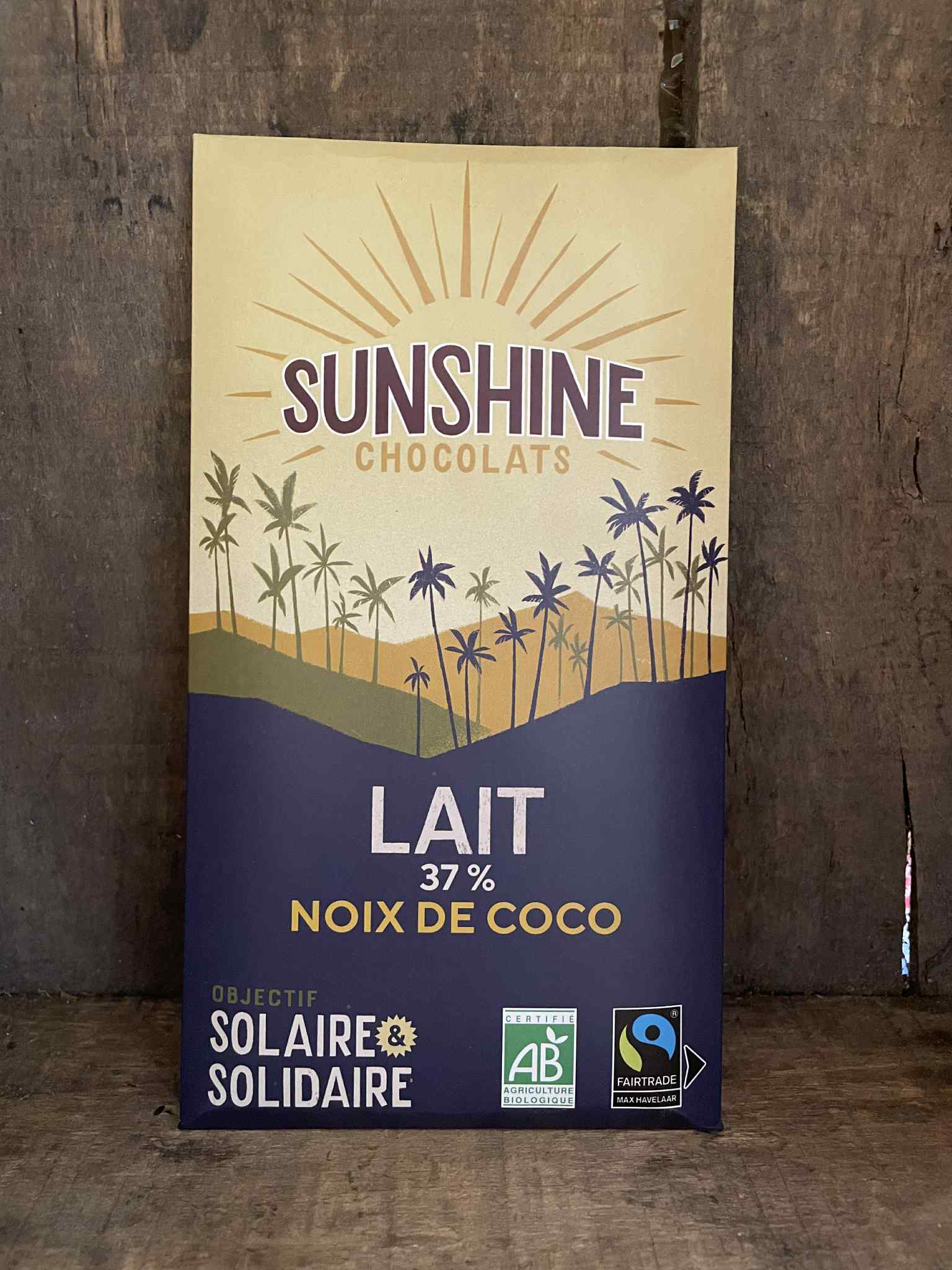 sucre de canne*, beurre de cacao*, lait entier* (18%), cacao*, pulpe de coco (10%), lait écrémé*, émulsifiant (lécithine de tournesol*), fleur de sel, vanille de Bourbon*. Cacao : 37% minimum.